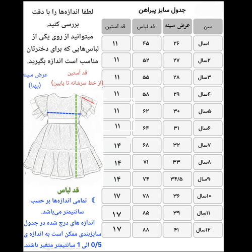 اندازه های درج شده در جدول سایزبندی ممکن است به اندازه ی نیم الی 1 سانتیمتر متغیر باشند.